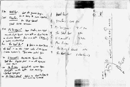 After showering and watching the Simpsons, we all met in the hotel bar at 5:30. Sean was busy drawing up a map to guide us all using the information he had gotten from Brian. I was busy getting a pint.