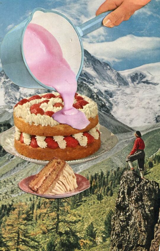 Oh how I want to be that lone figure on that mountain top tempted by an enormous strawberry shortcake. The image of the pink frosting slowly melting out of the pot makes your mouth water in sweet anticipation. Just look how these very different scenes blend together.