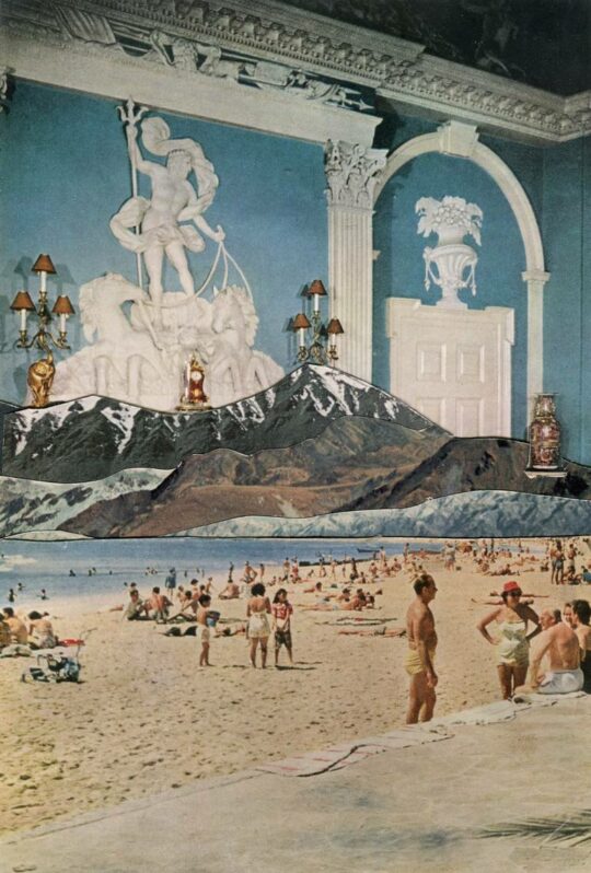 The three-dimensional feel of this piece called ‘Beach Life’ is amazing. As your eyes scan up from the serenity of vacationers on a beach, to the cool air of the mountain snowcaps, and finally an indoor setting. It’s as if this is all taking place inside some mansion or museum.
