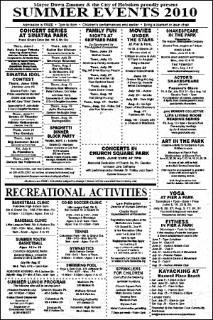 The Hoboben Website has posted a printable PDF of this year’s city-sponsored events. Admission to all of these events are free and run from 7:00 to 9:00 PM (kids events end earlier). Click on the image below to get your copy: