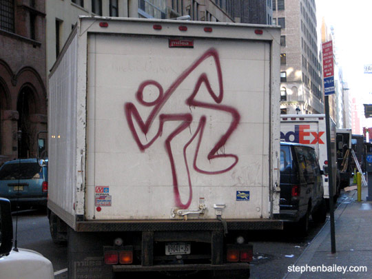 There’s a shit-ton of graffiti littering the multitude of small deliver trucks in NYC. Most are hideous tags. Few stand out as art. Like this simple purple dancer seen on a truck on the corner of 32nd Street and Fifth Avenue in Manhattan.