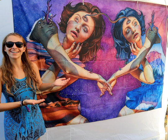 During the summer, Kaitlyn’s work can be seen at events throughout the country including Bonnaroo Music Festival in Tennessee, Electric Forest in Michigan, Secret Dreams Festival in Ohio, and more. Prints of her work can be purchased online year round as well as other products including apparel, mugs, tapestries, and more from her shop based in Fairview, PA.